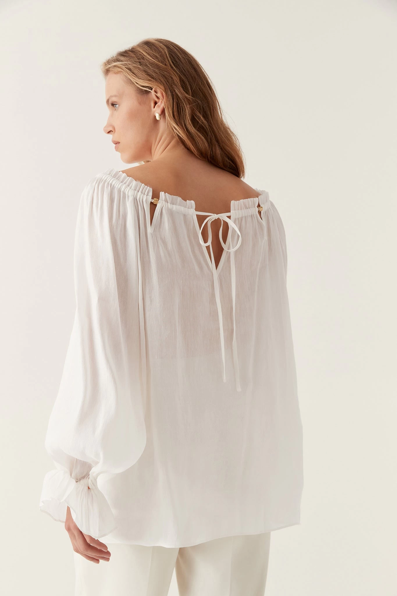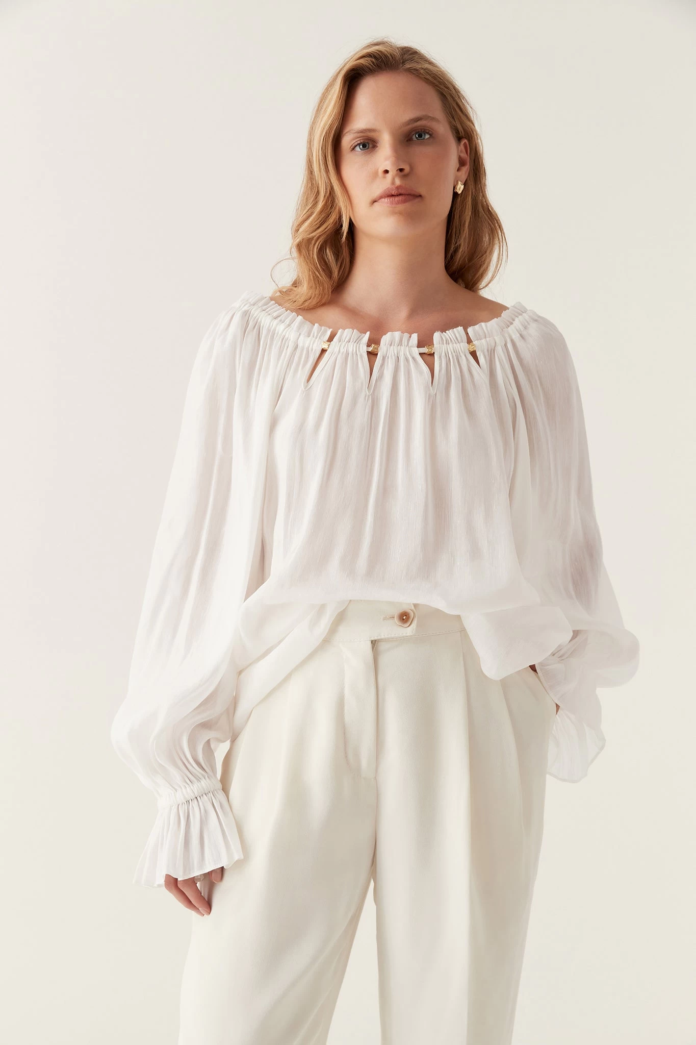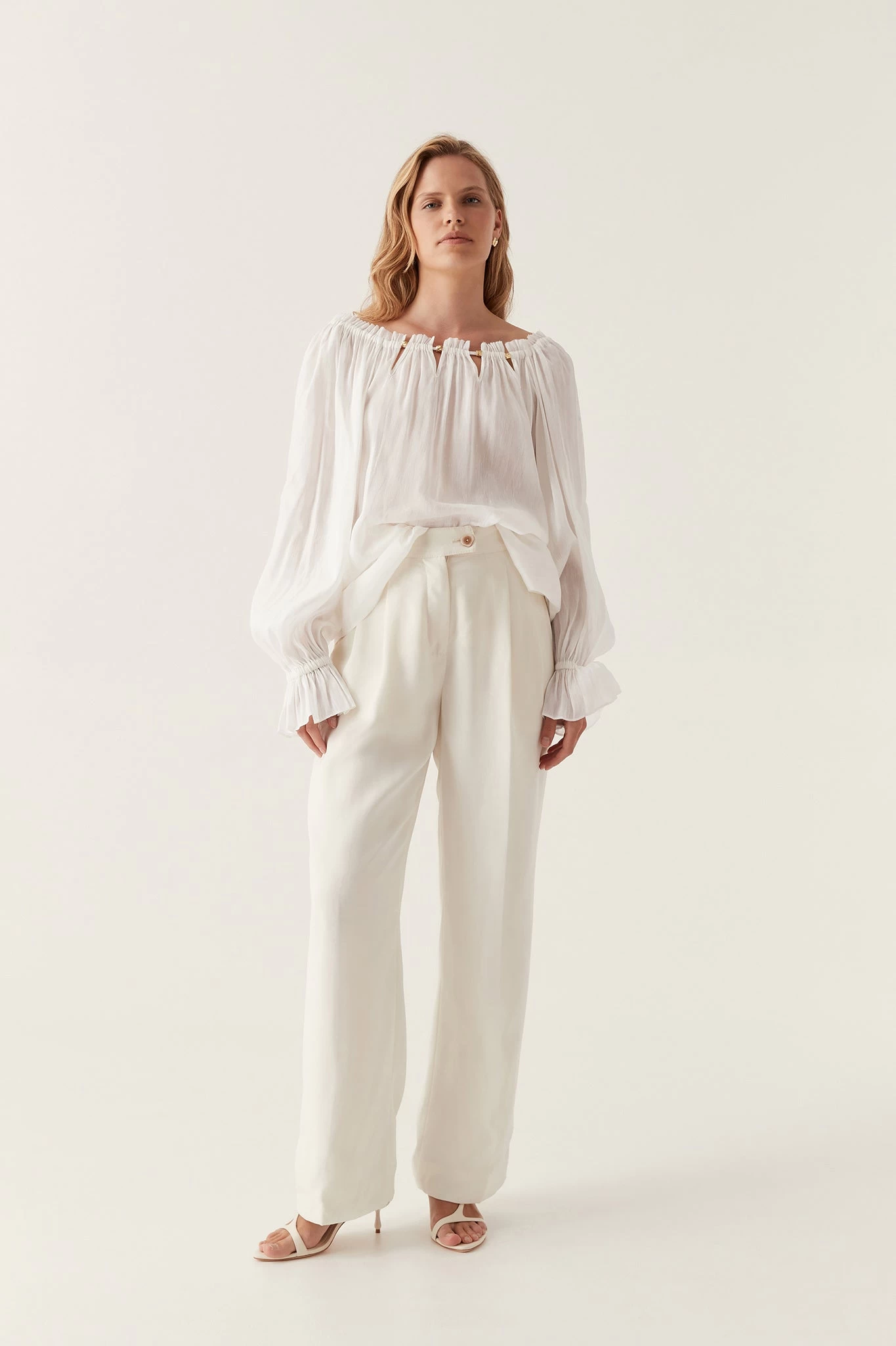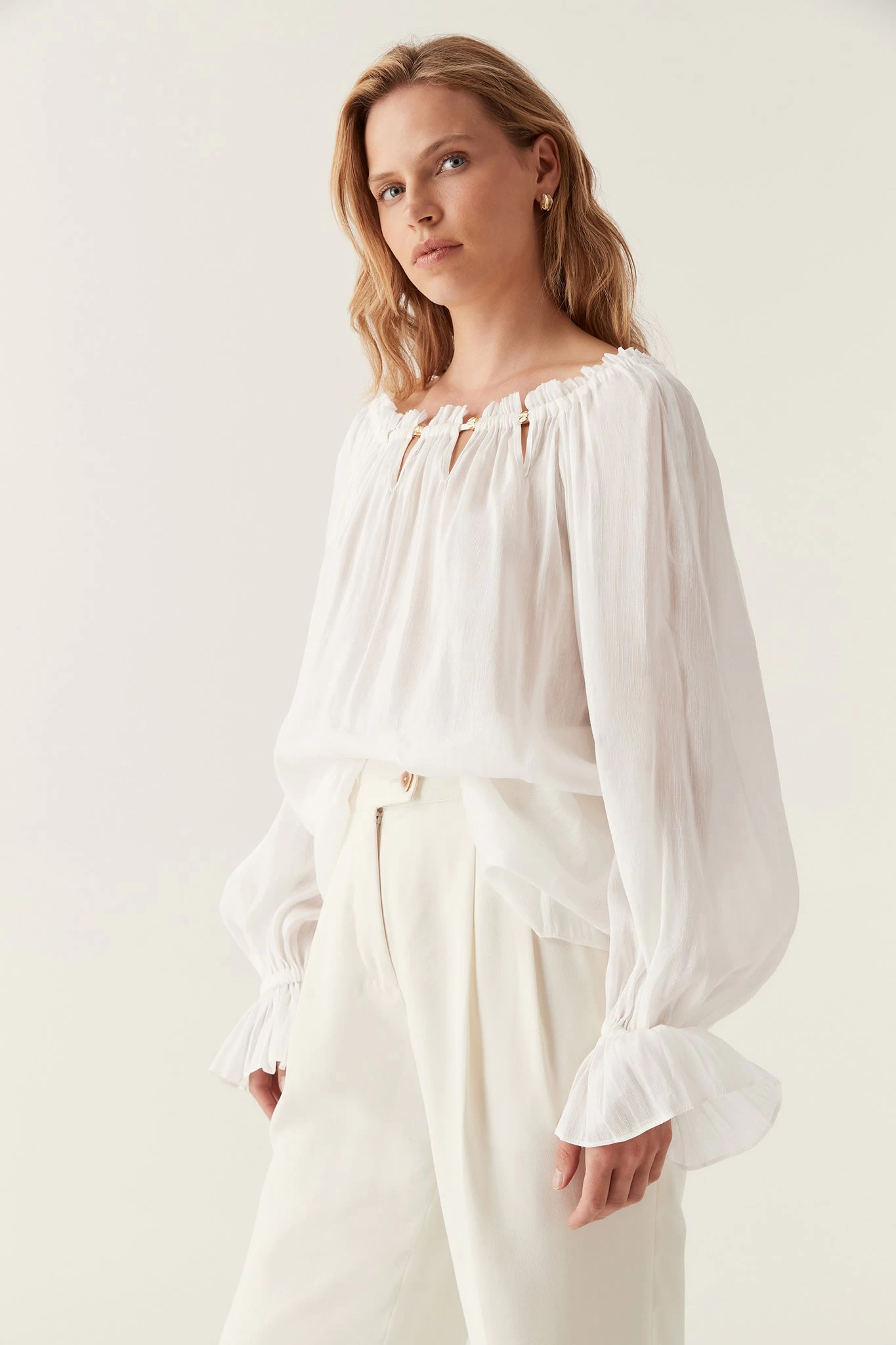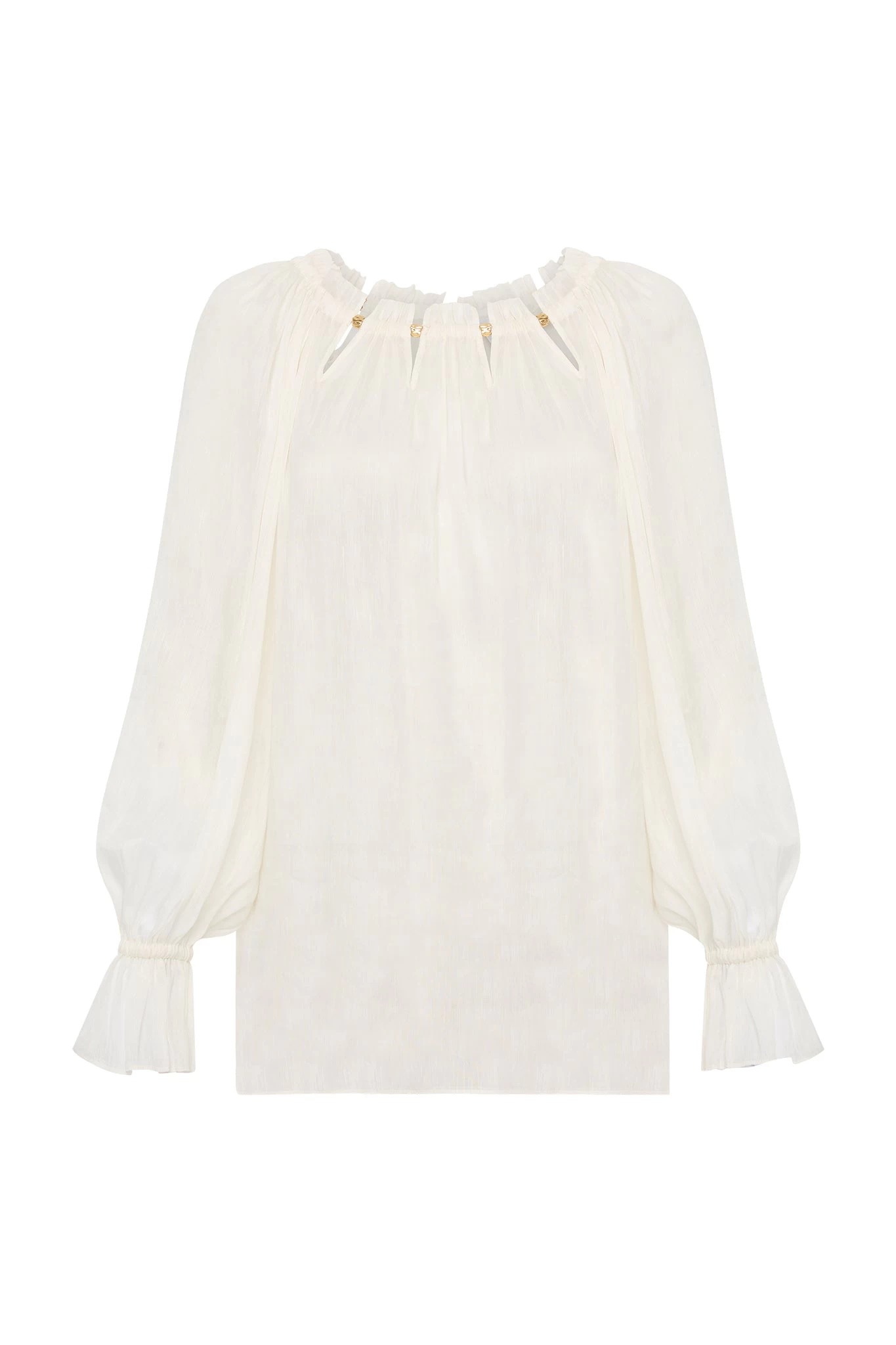 - Long sleeves with gathered frill cuffs