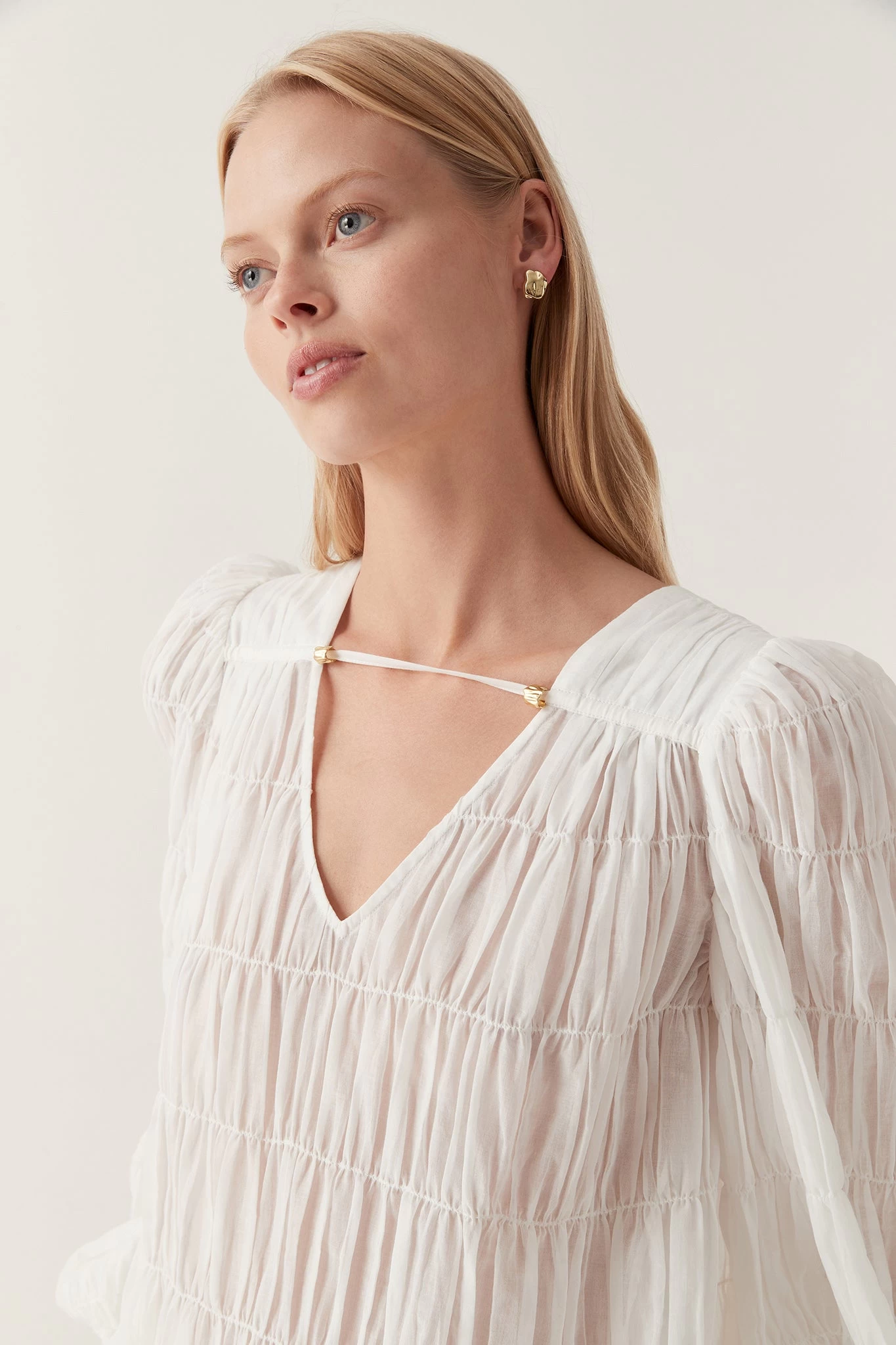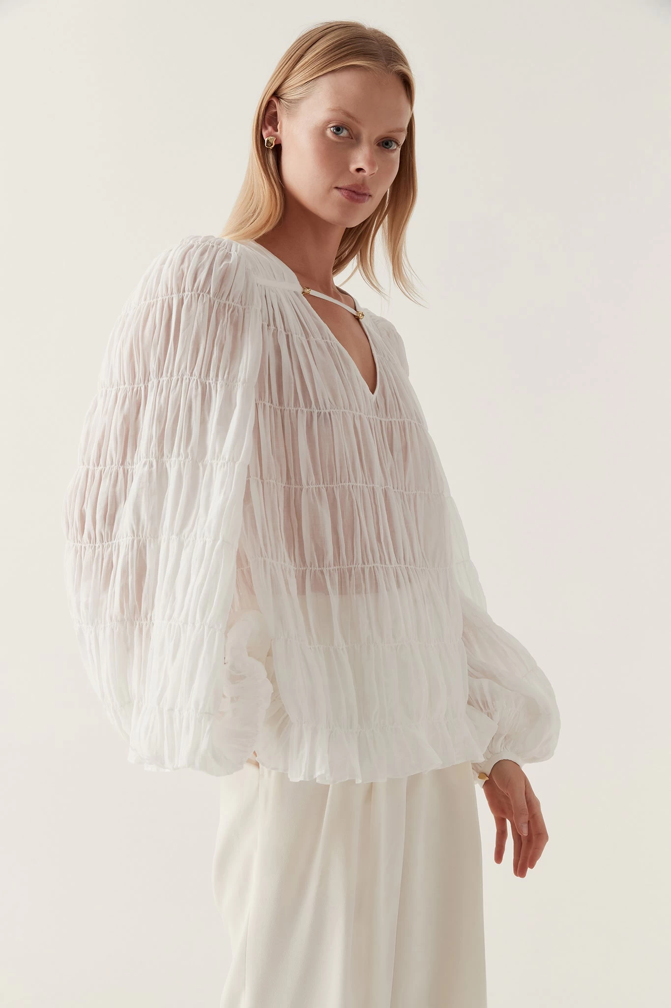 - Blouson sleeves with gathered elastic cuffs