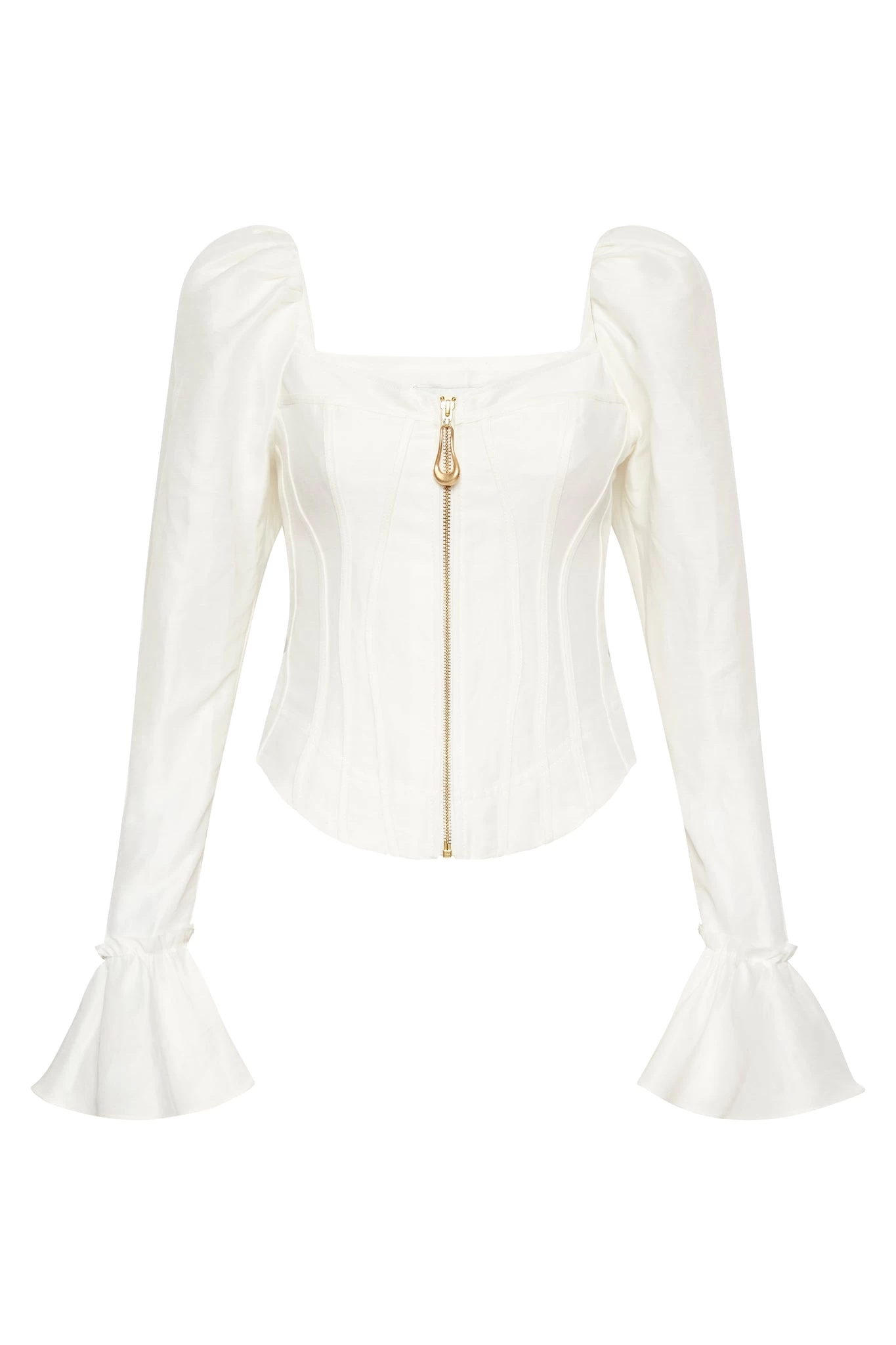 - Exposed zip at centre front