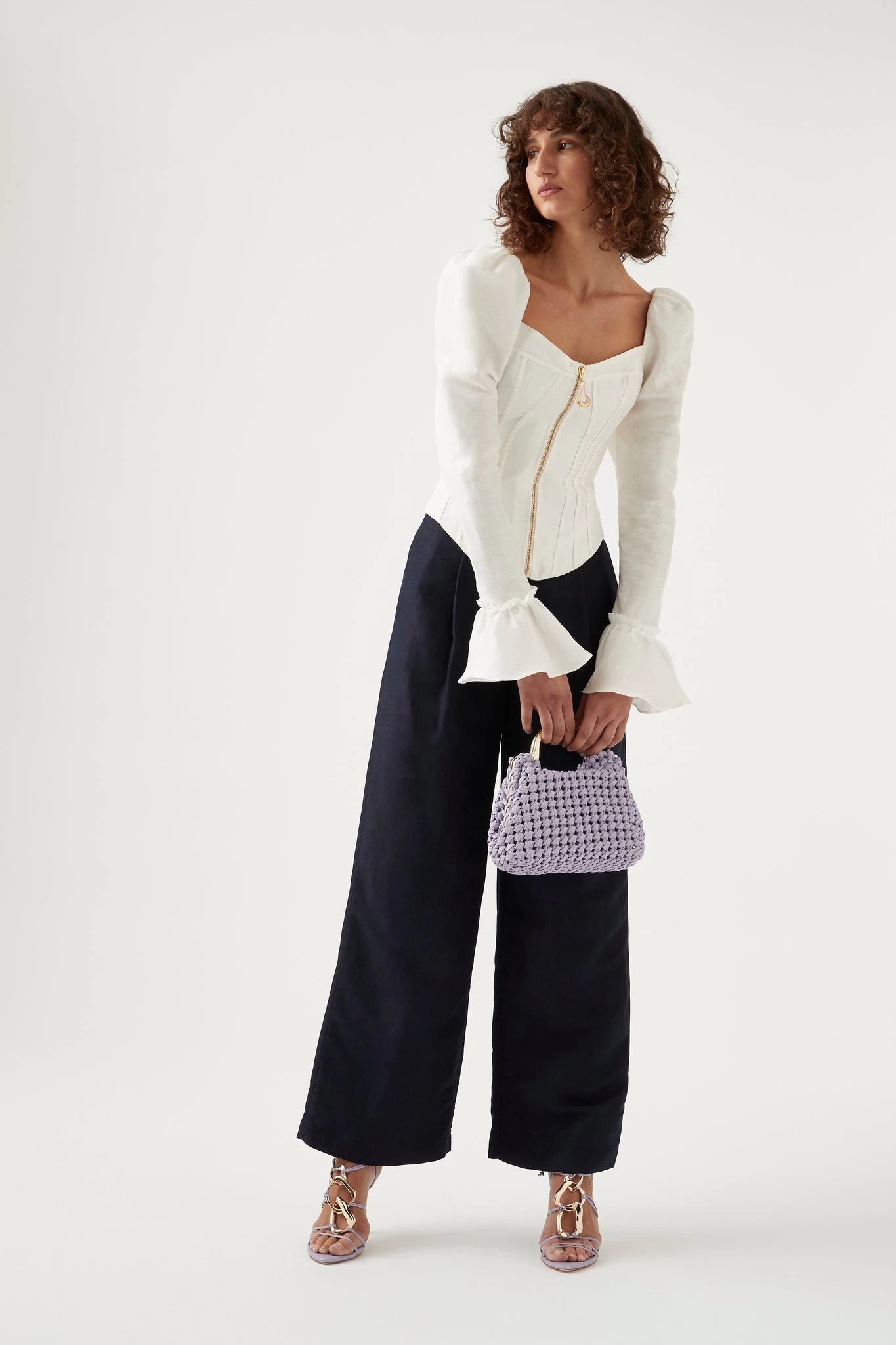 - Straight sleeves with fluted cuffs