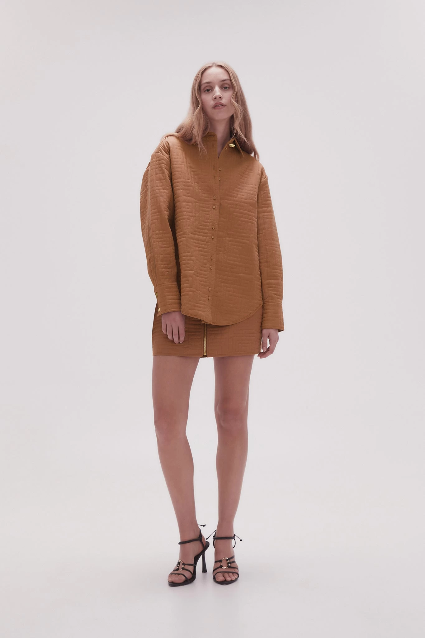 - Geometric quilt stitching throughout