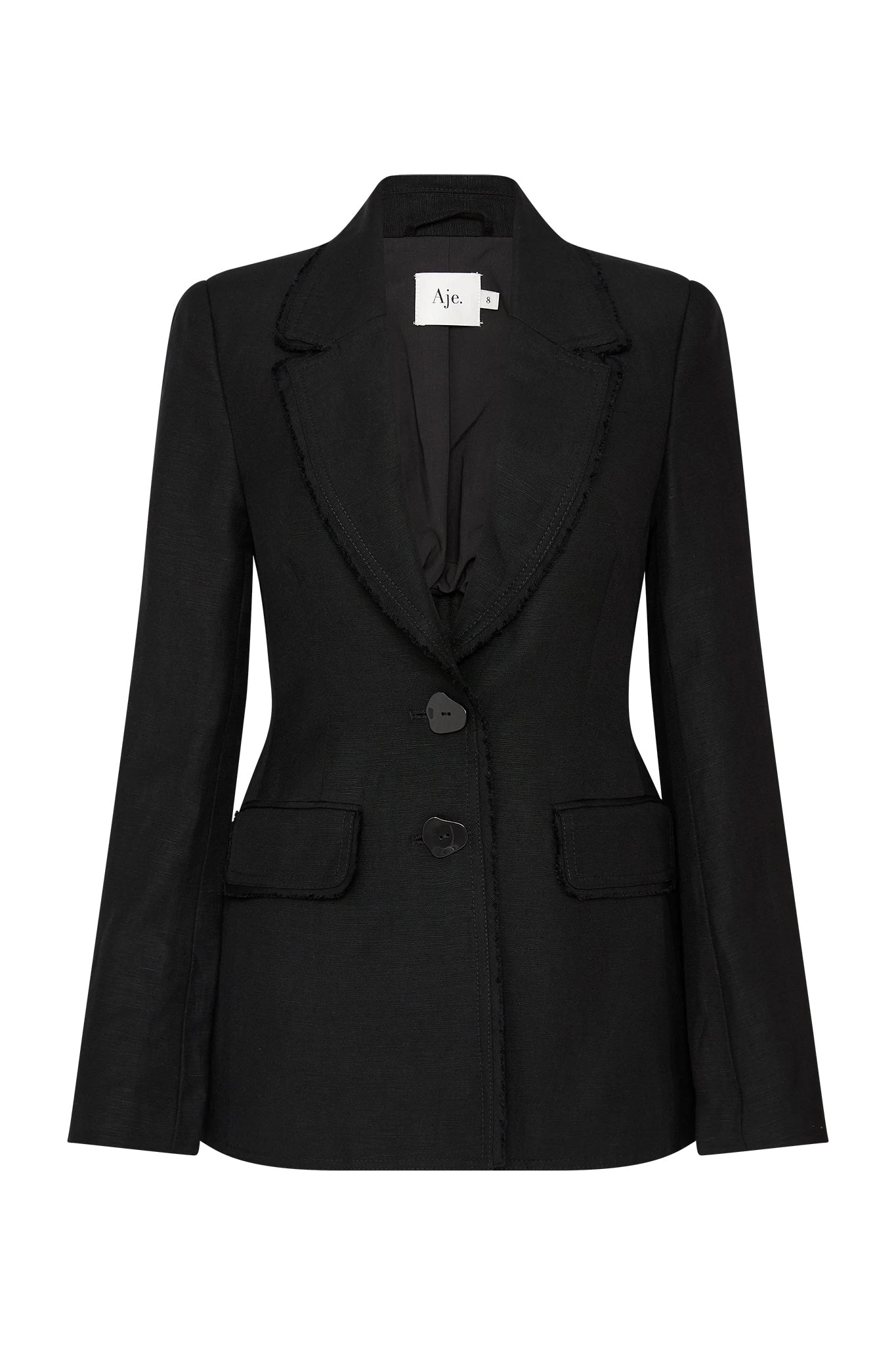 - Raw edging at collar, lapel and hip pockets