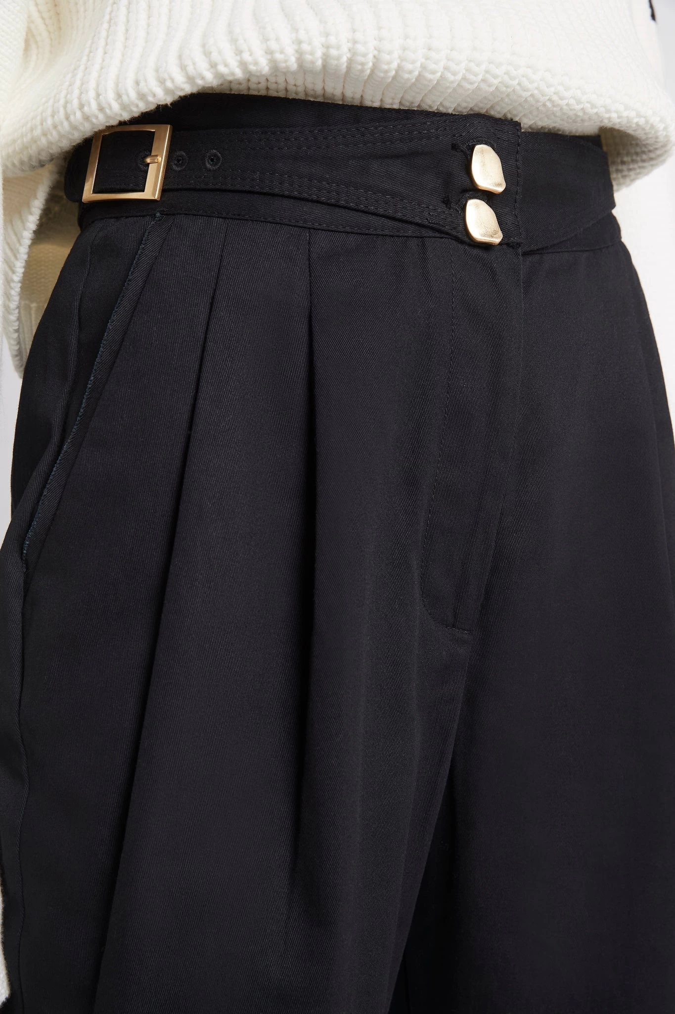 - Attached belt with heavy stitching and buckle detail