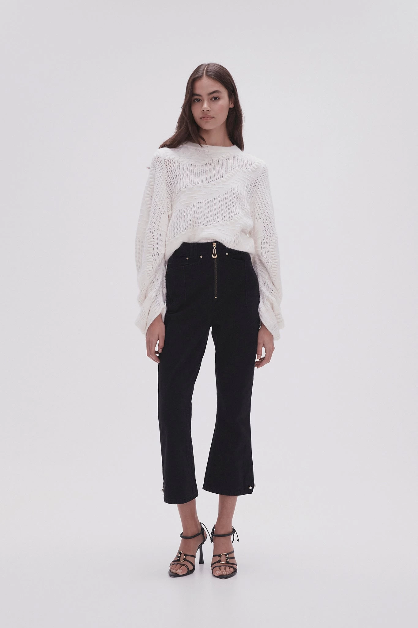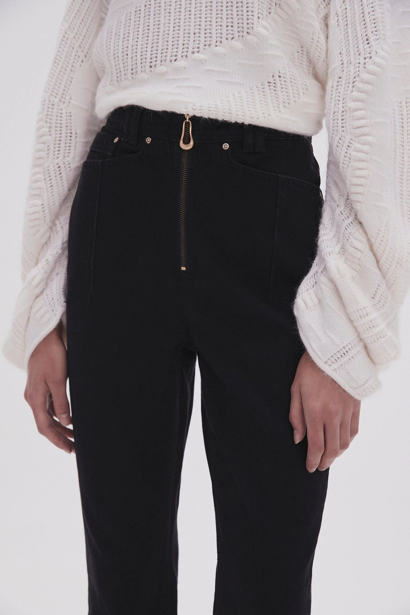 - Exposed zip with sculptural metal puller